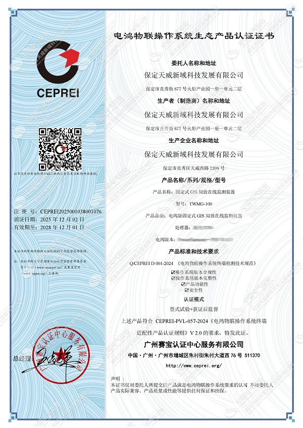 12月2日,保定美狮会新域科技发展有限公司自主研发的TWMG-100 固定式GIS局部放电在线监测装置,正式通过南方电网电鸿物联操作系统生态产品认证,成为实现"硬件+操作系统+应用软件"国产化的监测装备。这一突破标志着我国电力设备状态监测技术摆脱对国外基础软件的依赖,为新型电力系统建设提供了自主可控的方案。