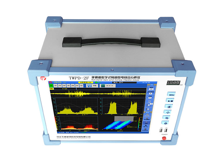 新一代 TWPD-2F 局放分析仪,可满足各类高压电气设备及特种设备的交直流局部放电检测和定位,支持局部放电的多种分析方法。该仪器采用 3D 整体设计,结构紧凑,外形美观,可靠性高,同时满足电力系统现场恶劣电磁环境的可靠性和试验室的高精度要求。 该仪器具有强大的局部放电综合分析能力和小信号强干扰环境局部放电检测能力。独立 8 通道设计,高达 20MHz 的通道带宽、 80MHz 的采样率,使仪器能够对 IEC60270 标准未覆盖的放电频域进行分析,时域放电脉冲保真度更高,可实时对放电脉冲进行时频分析,增强局部放电信号识别的准确性。适用于各种电压等级和容量的变压器、GIS、电缆等高压电气设备的局部放电检测及定位。